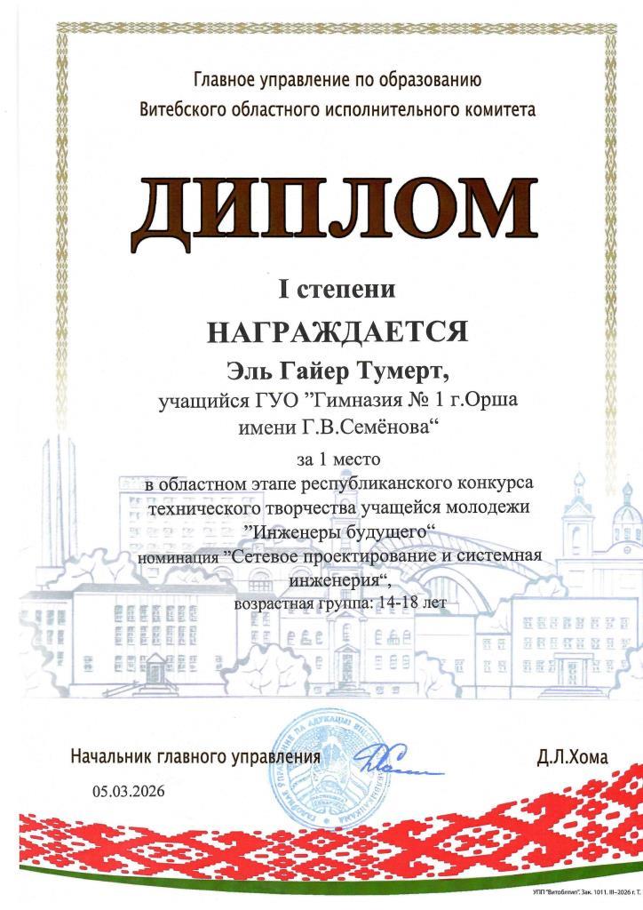 Учащийся 11 "А" класса гимназии № 1 Эль Гайер Тумерт занял первое место в номинации Номинация ”Сетевое проектирование и системная инженерия“. Тумерт в составе команды Витебской области будет выступать на заключительном этапе республиканского конкурса технического творчества учащейся молодёжи ”Инженеры будущего“, который пройдёт в г. Минске на базе УО ”Национальный детский технопарк“ с 30 марта по 1 апреля 2026 года. Пожелаем успехов!